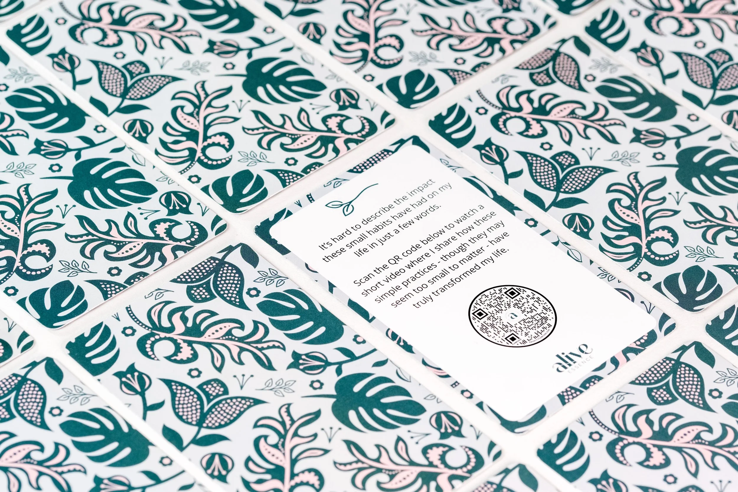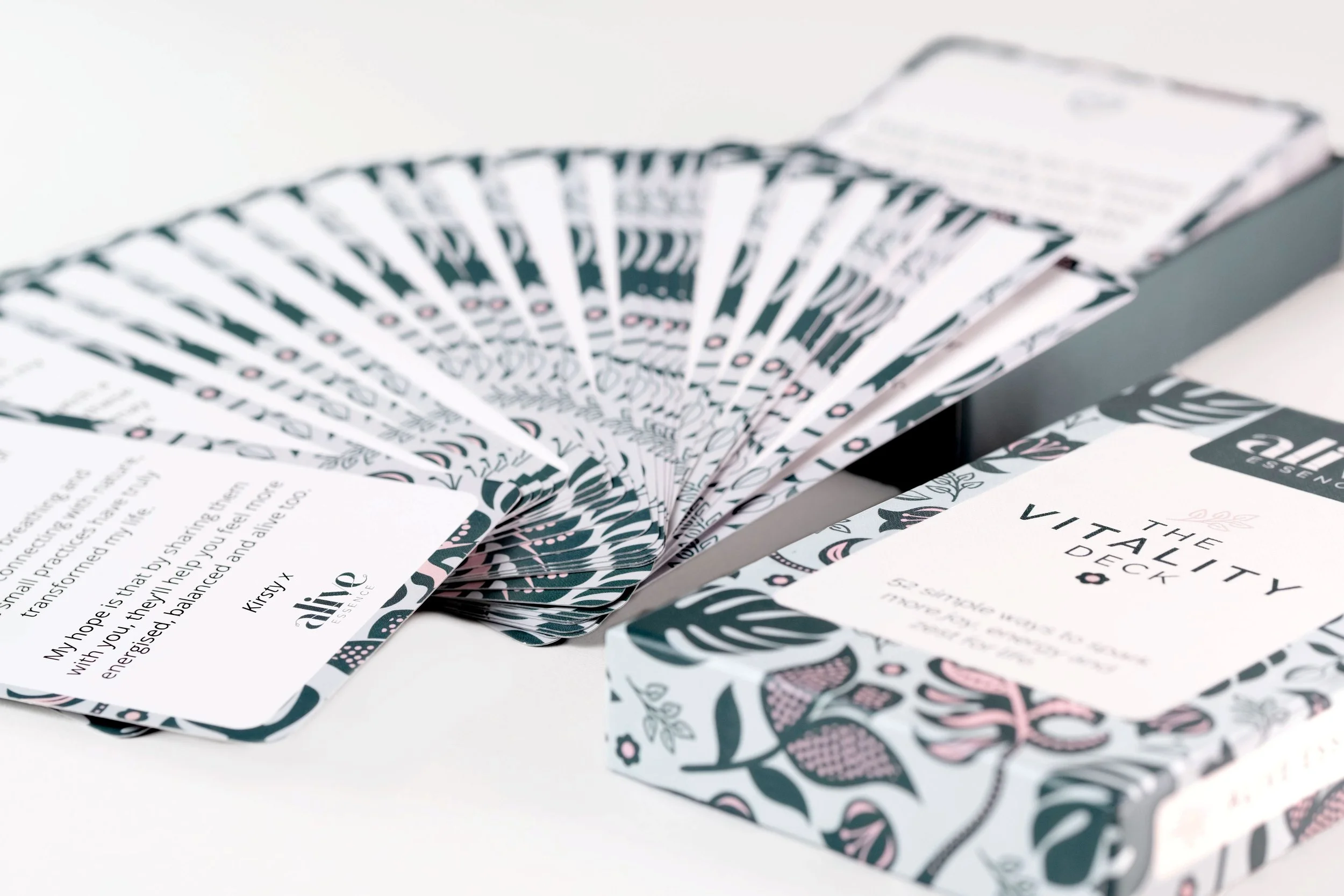Client: Alive Essence | Branding, Pattern & Packaging DesignAlive Essence is rooted in the idea of simple, intentional actions that help us stay balanced, energised and joyful. After completing the initial branding, my client Kirsty developed The Vitality Deck, a set of cards designed to support everyday wellbeing, and needed the design to sit seamlessly within the existing brand.
